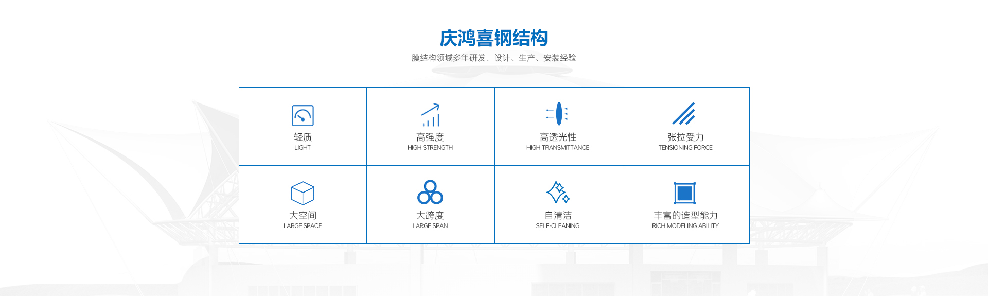 ????????安徽省慶鴻喜鋼結構有限公司是一家專業從事膜結構工程的綜合性公司。公司秉承“信譽第一、質量第一”的宗旨。開拓、發展、創新的理念。目前公司主營膜結構設計、膜裁剪設計、膜材加工及鋼結構安裝與維修。公司擁有一批國內較早從事膜結構行業的高素質技術人員和安裝隊伍,擁有先進的鋼膜設計軟件3D3S、forten32、和FSCAD,在設計上大膽創新,在加工上精益求精,在施工上安全認證,在售后上讓客戶使用放心。